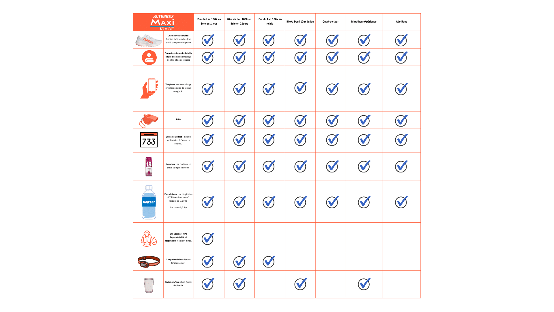 - Ne pas avoir de veste imperméable et respirante de taille adulte sur les courses où elle est obligatoire