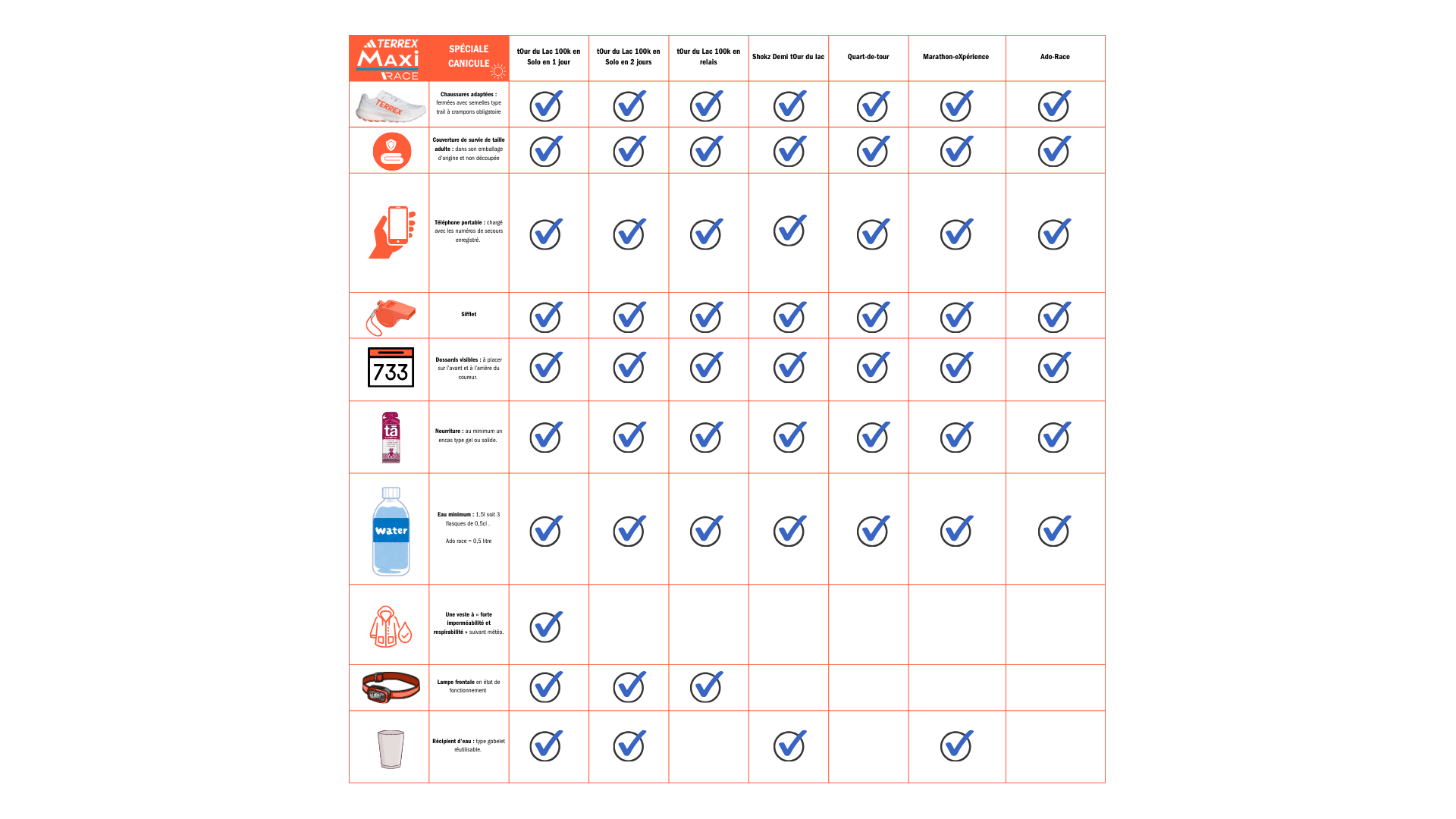 - Ne pas avoir un récipient d’eau en plus de votre réserve d’eau (type gobelet) sur les courses où il est obligatoire.